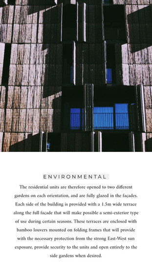 The residential units are opened to two different gardens on each orientation, and are fully glazed in the facades. Each side of the building is provided with a 1.5m wide terrace along the full façade that will provide a semi-exterior type of use during certain seasons. These terraces are enclosed with bamboo louvers mounted on folding frames that will provide with the necessary protection from the strong East-West sun exposure, provide security to the units and open entirely to the side gardens when desired. The bamboo is treated to last, and fireproofed and can easily be cut off the mesh and replaced.